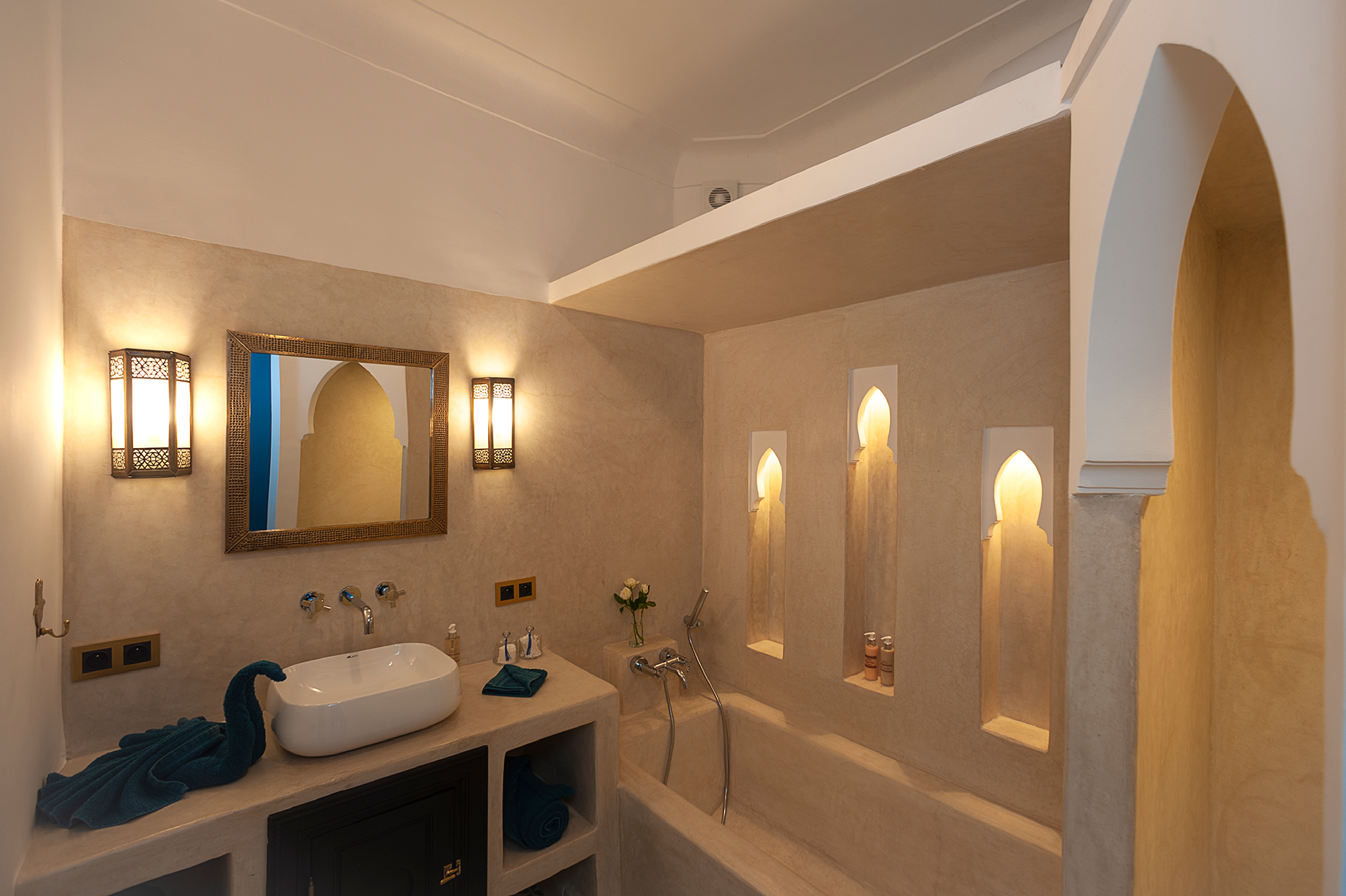 Salle de bain avec toilettes, baignoire et douche séparée, murs en Tadelakt et sol en carreaux de ciment.