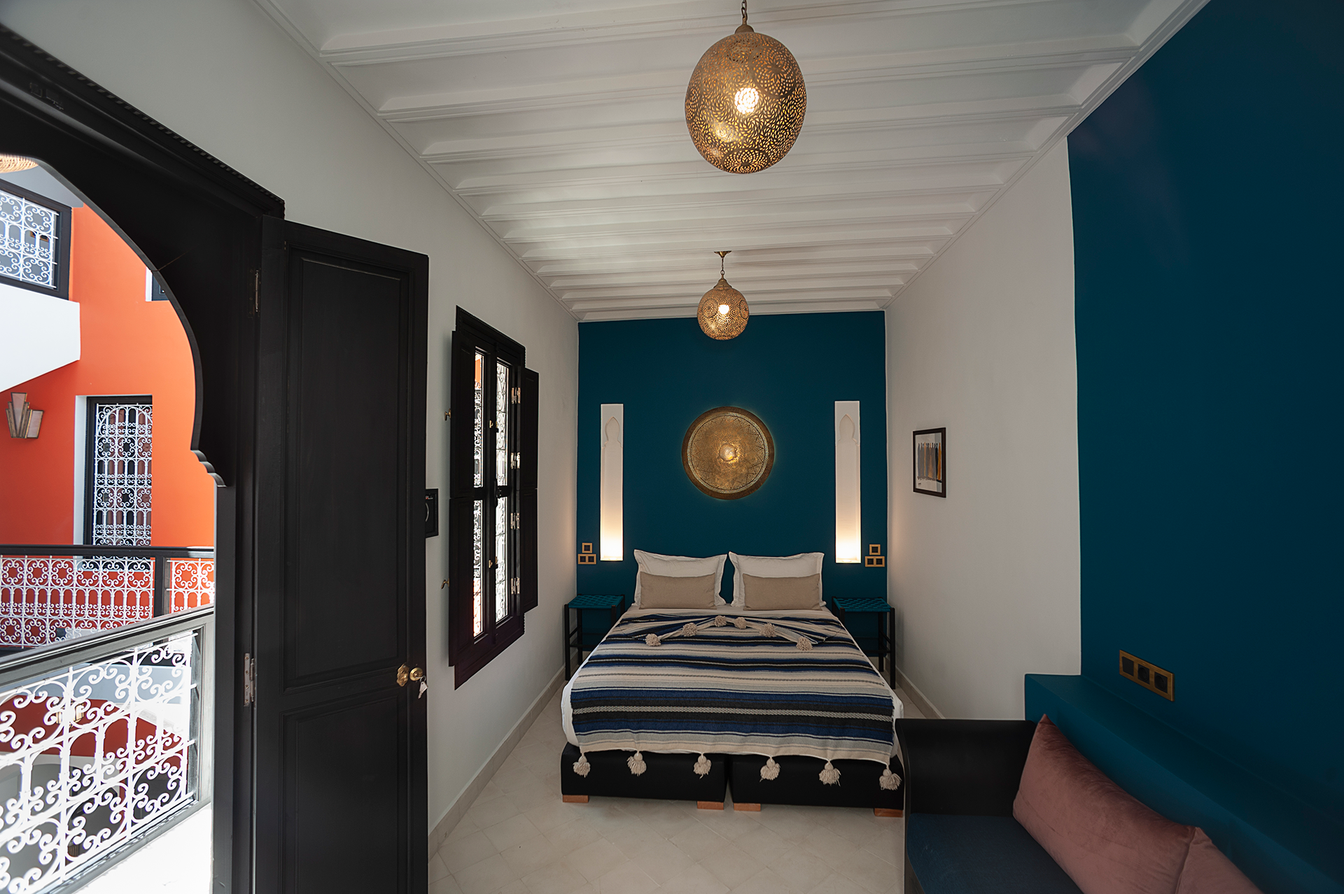 Le bleu et le blanc font de cette chambre un endroit particulièrement apaisant.